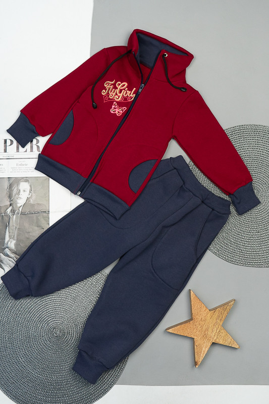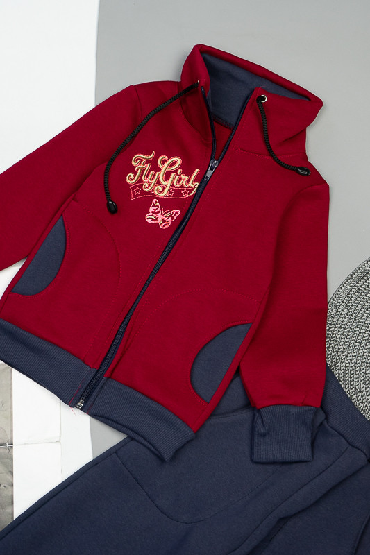 Двоколірний теплий костюм виготовлений для дівчаток 2-3 років. Він практичний та зручний. Костюм складається з курточки на блискавці та штанів на манжетах. Модель прикрашена вишивкою. Костюм виготовлений з теплого і м'якого трикотажного полотна – тринитка пен’є. Це щільний матеріал, основою якого є бавовна. Дане полотно стійке до ковтунів, розтягування матеріалу, служить тривалий час і не змінює форму. Це натуральна тканина. Вона пропускає повітря, в результаті чого шкіра може дихати, а завдяки начісуванню тримати тепло. Тринитка приємна до тіла і відчуттів. Рекомендований догляд - це делікатне прання при температурі не більше 35°C, прасування тільки з лицьового боку.