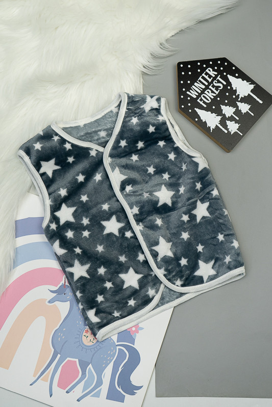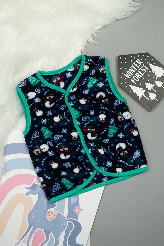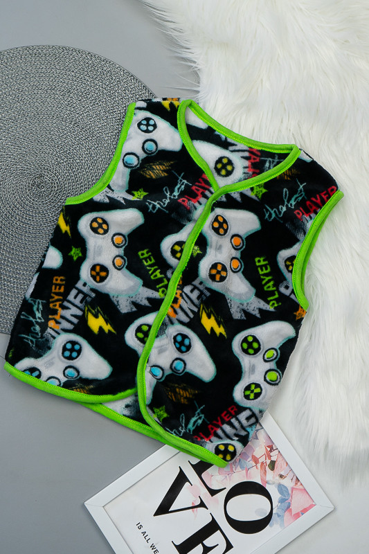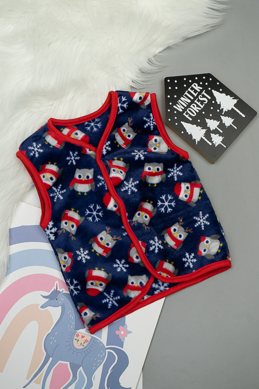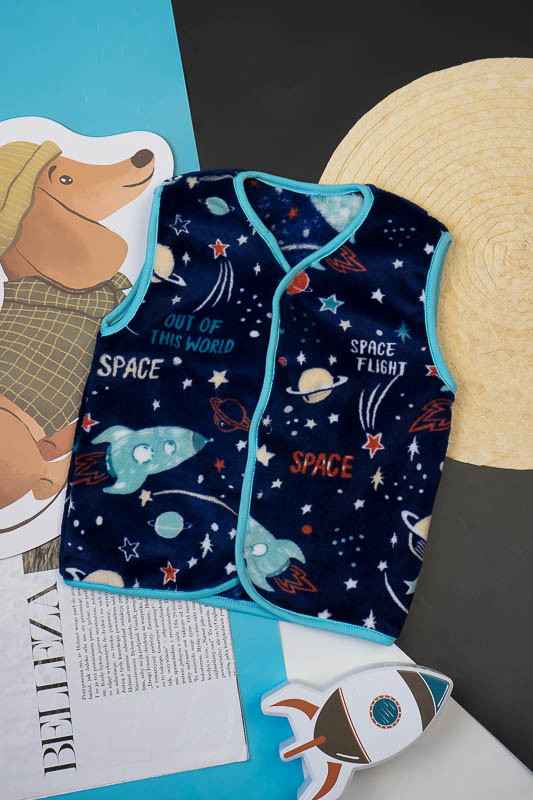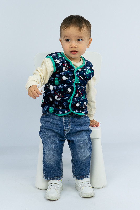 Така жилетка пошита з трикотажного полотна - велсофт або махра. Махра (Велсофт) - м'яка, легка та міцна тканина. Гіпоалергенна, характеризується високою зносостійкістю та дарує приємні відчуття при носінні. Вироби з махри (велсофту) мають прекрасну повітропроникність і високу гігієнічність, тримають тепло і не мнуться після прання. З такої тканини можна пошити зручний і гарний халат. Крім одягу, велсофт використовують для пошиття теплих ніжних ковдр. Велсофт швидко завоював популярність, особливо при пошитті дитячого одягу, адже широка палітра кольорів дозволяє пошити з велсофту дитячі шапочки, комбінезончики, халатики, шкарпетки, штанці, кофточки. Довгий ворс, міцність, м'якість цієї тканини дозволили їй швидко завоювати свою нішу на ринку та стати високозатребуваною. Махра полірована має ще більшу м'якість і ніжність, а також має легкий блиск. Цей жилет зігріє Ваших дітей у холодну погоду.