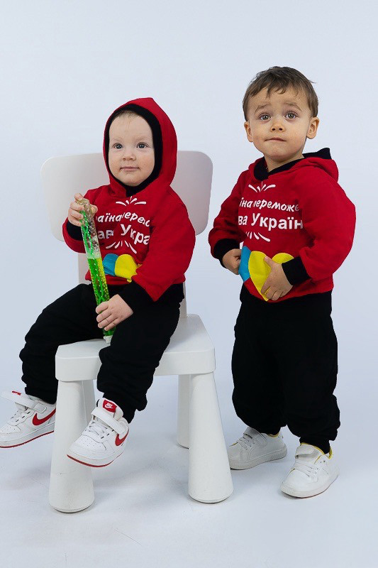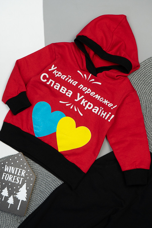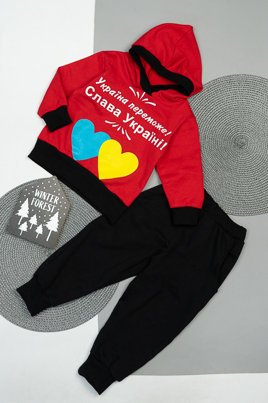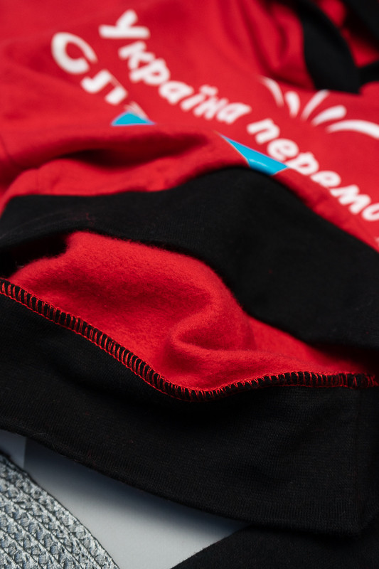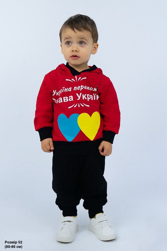 Двоколірний теплий костюм виготовлений для дітей від одного до трьох років. Він практичний та зручний. Костюм складається з джемпера з капюшоном та штанів на манжетах. Модель прикрашена патріотичним малюнком. Костюм виготовлений з трикотажного полотна – начісного футера, основою якого є 100% бавовна. Лицьова сторона матеріалу гладка, схожа на кулірне переплетення, виворіт полотна має невеликий м'який ворс. Плюсами футера є висока щільність, гігроскопічність та повітропроникність. Через натуральну основу матеріал можна вважати екологічним та гіпоалергенним. Є деякі негативні моменти – матерія погано реагує на вплив прямих сонячних променів та високих температур під час прання. Тому, щоб виріб не дав усадку, прати його рекомендують за температури не вище 30-40°С. Через наявність накату прасувати виріб рекомендується з виворітного боку із застосуванням парогенератора.