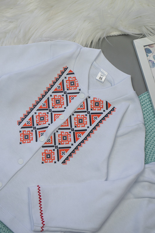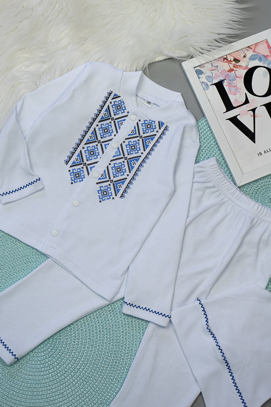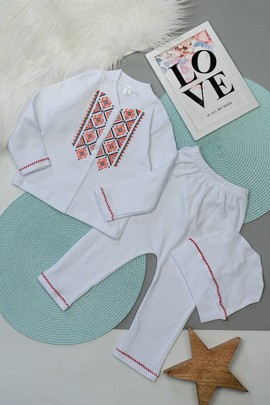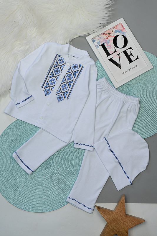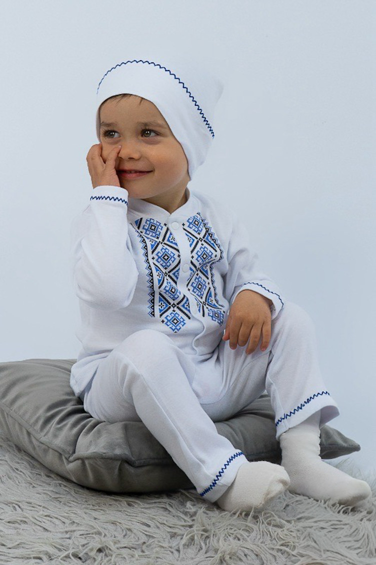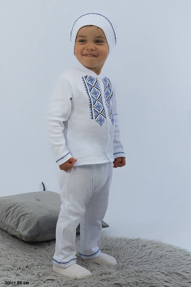 Святковий комплект для маленьких хлопчиків від ТМ «Гном» складається з кофтинки на кнопках, ясельних штанців та шапочки. Прикрашає модель малюнок української вишиванки. Комплект виготовлений з інтерлока. Це трикотажне полотно, основою якого є бавовна. Це дуже ніжний і приємний до тіла матеріал, який володіє підвищеною теплоізоляцією, тому зберігає тіло малюка в теплі та комфорті. При пранні рекомендується вибирати делікатний або ручний режим, при температурі не вище 40°C.