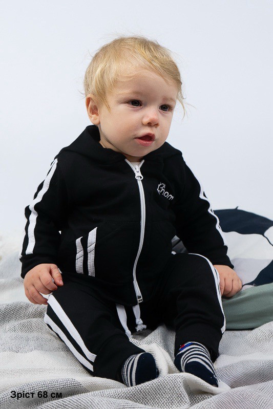 ТМ «Гном» пропонує зручний та яскравий спортивний костюм для малюків. Класична однотонна модель прикрашена деталями оздоблювального кольору - лампасами, змійкою, шнурком та вишитим написом. Таке доповнення в поєднанні з вільним прямим кроєм робить модель стильною, модною, при цьому практичною та універсальною річчю. Виготовлений костюм із щільного та м'якого трикотажного полотна – двунитка. Ще його називають футер-стрейч. Поєднання базових властивостей трикотажу та ефекту від додавання у в'язку футерної нитки повідомляє матеріалу наступні властивості: добре вбирає вологу; ефективно пропускає повітря; має високу теплоощадну здатність; не утворює пилок (ковтунів); не витягується при носінні; простий у догляді. Виріб слід прати у теплій воді. Температури води, що дорівнює 30°C, буде достатньо для якісного прання матеріалу. Від прасування краще відмовитися або ж прасувати із застосуванням пару з виворітного боку.