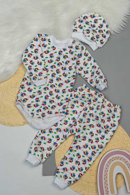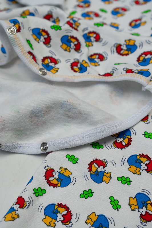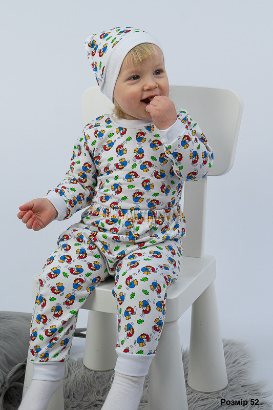 Ясельний комплект виготовлений для малюків від народження до 9-12 місяців. Складається він з боді на довгий рукав, штанів на манжетах та шапочки. В такому комплекті ваша дитина буде почуватися затишно і комфортно. М'який та приємний до тіла матеріал вдало поєднуються зі зручним кроєм. Боді має на плечі застібку - кнопки. Модель пошита із трикотажного полотна – начісного футера, основою якого є 100% бавовни. Лицьова сторона матеріалу гладка, а виворітна має невеликий м’який ворс. Плюсами футера є висока щільність, гігроскопічність, гіпоалергенність. Та є і негативні моменти. Це вигорання на прямих сонячних променях та реакція на високі температури під час прання. Тому, щоб виріб не дав усадку, прати рекомендовано при температурі не вище 30-40°C. Через наявність накату прасувати потрібно з виворітного боку із застосуванням парогенератора чи з лицьової сторони, не торкаючись малюнка.
