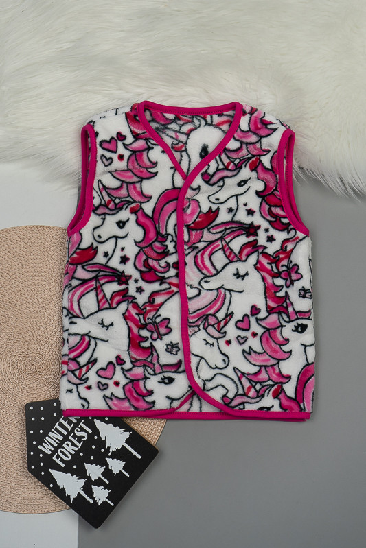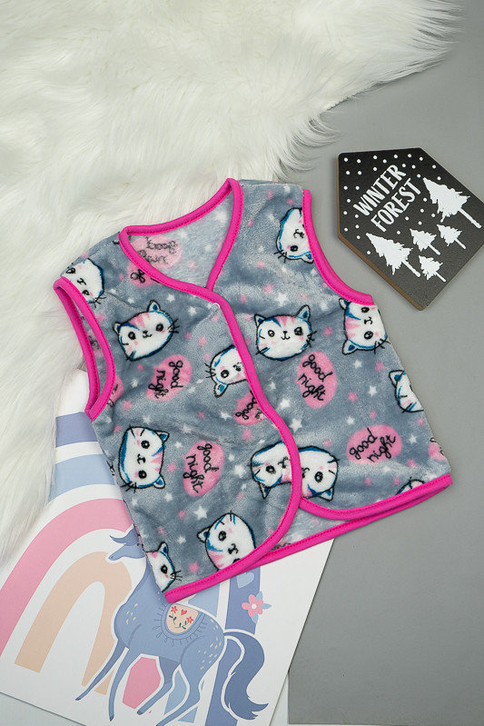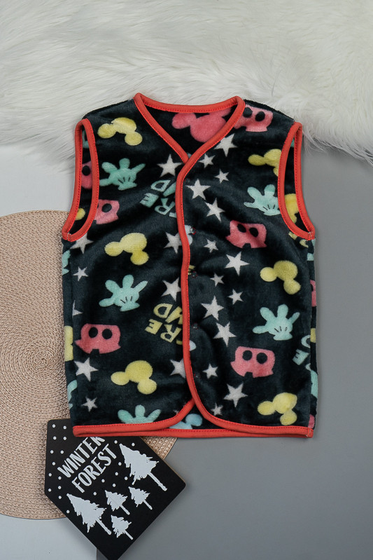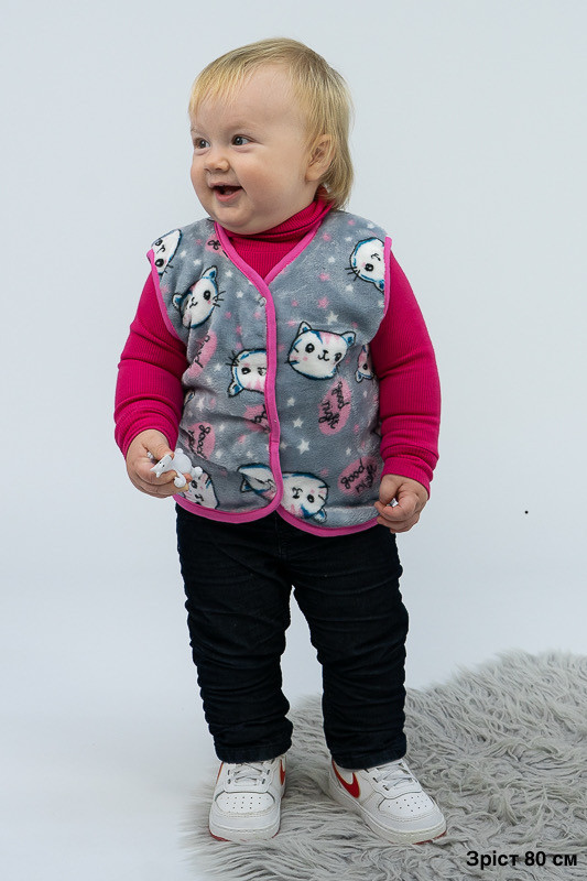 Така жилетка пошита з трикотажного полотна - велсофт або махра. Махра (Велсофт) - м'яка, легка та міцна тканина. Гіпоалергенна, характеризується високою зносостійкістю та дарує приємні відчуття при носінні. Вироби з махри (велсофту) мають прекрасну повітропроникність і високу гігієнічність, тримають тепло і не мнуться після прання. З такої тканини можна пошити зручний і гарний халат. Крім одягу, велсофт використовують для пошиття теплих ніжних ковдр. Велсофт швидко завоював популярність, особливо при пошитті дитячого одягу, адже широка палітра кольорів дозволяє пошити з велсофту дитячі шапочки, комбінезончики, халатики, шкарпетки, штанці, кофточки. Довгий ворс, міцність, м'якість цієї тканини дозволили їй швидко завоювати свою нішу на ринку та стати високозатребуваною. Махра полірована має ще більшу м'якість і ніжність, а також має легкий блиск. Цей жилет зігріє Ваших дітей у холодну погоду.
