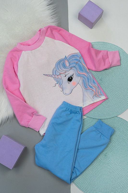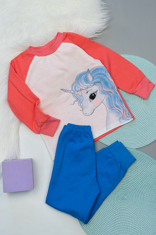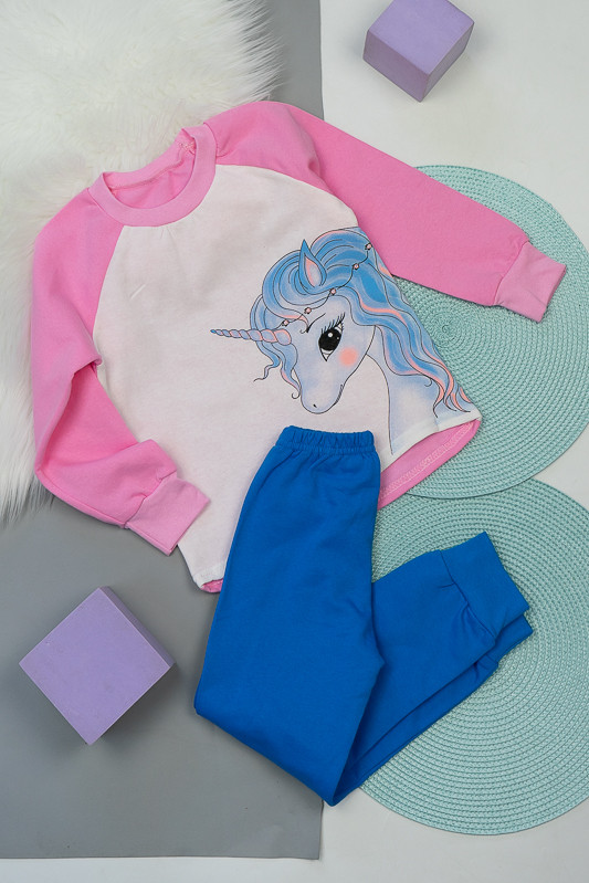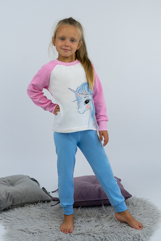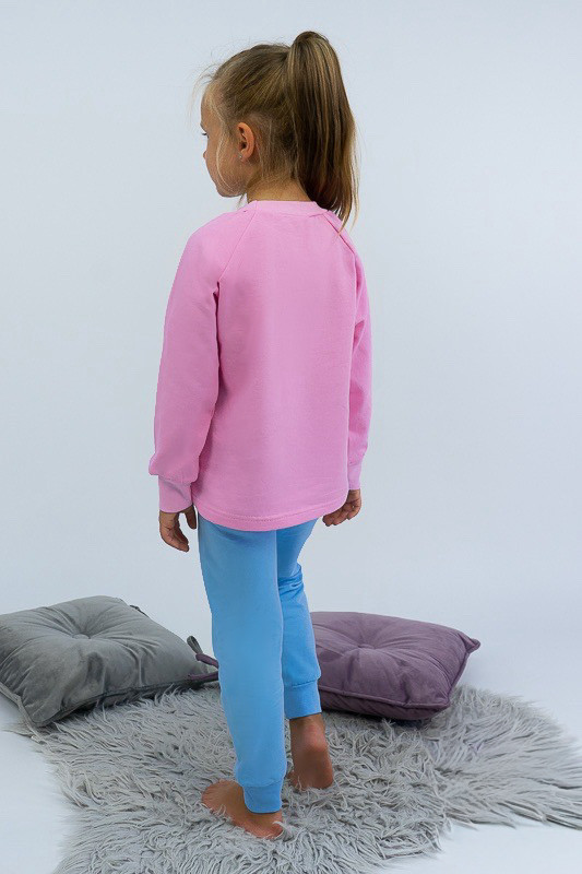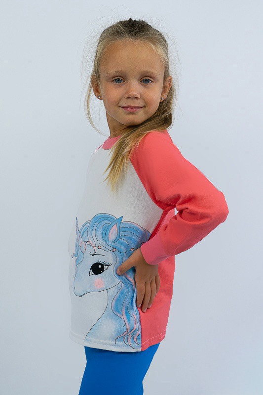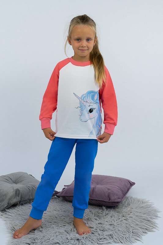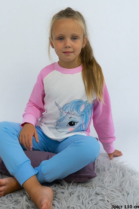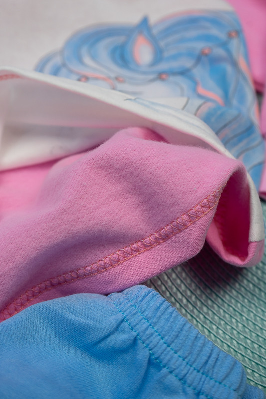 Приємна та затишна піжама виготовлена для дівчаток дошкільного віку. Комфортний легкий матеріал та вільний крій сприяють повноцінному відпочинку та приємному сну. Піжама виготовлена з трикотажного полотна – футера, основою якого є 100% бавовна. Лицьова сторона матеріалу гладка, схожа на кулірне переплетення, виворот полотна має невеликий м'який ворс. Плюсами футера висока щільність, гігроскопічність та повітропроникність. Через натуральну основу матеріал можна вважати екологічним та гіпоалергенним. Є деякі негативні моменти – матерія погано реагує на вплив прямих сонячних променів та високих температур під час прання. Тому, щоб виріб не дав усадку, рекомендують прати при температурі не вище 30-40°C.