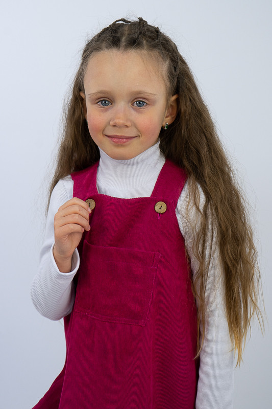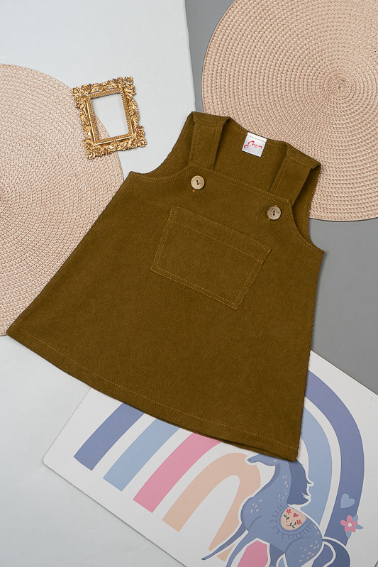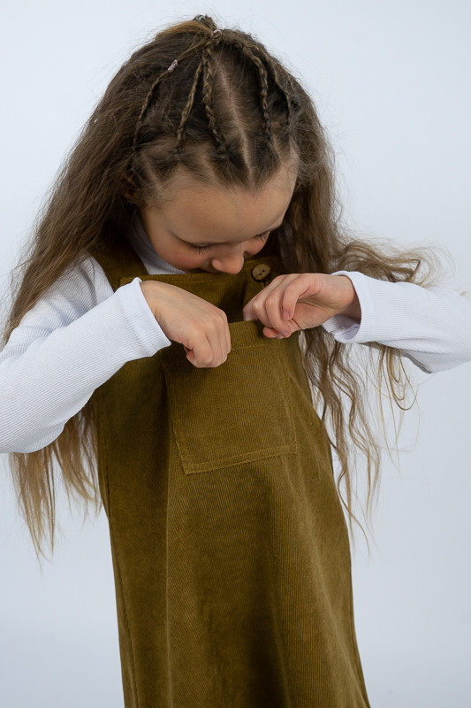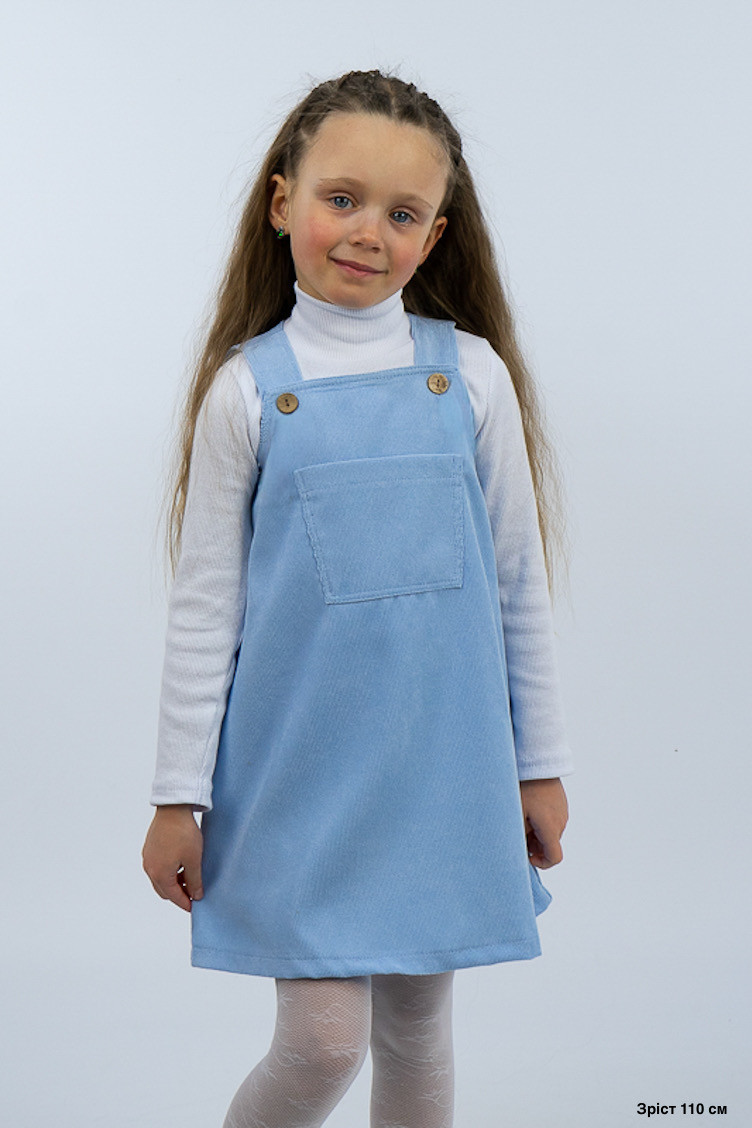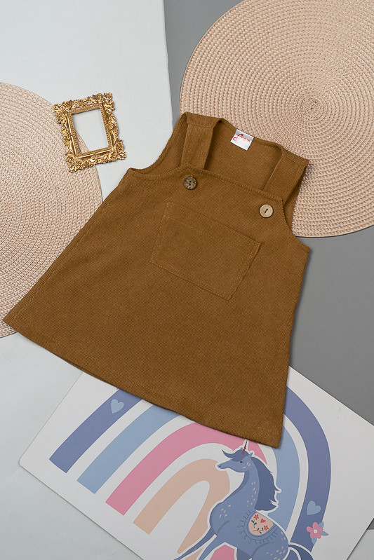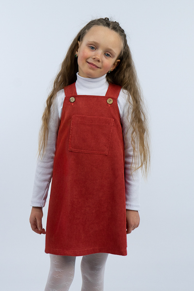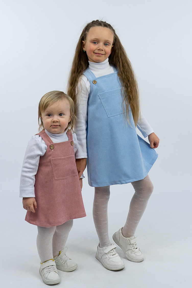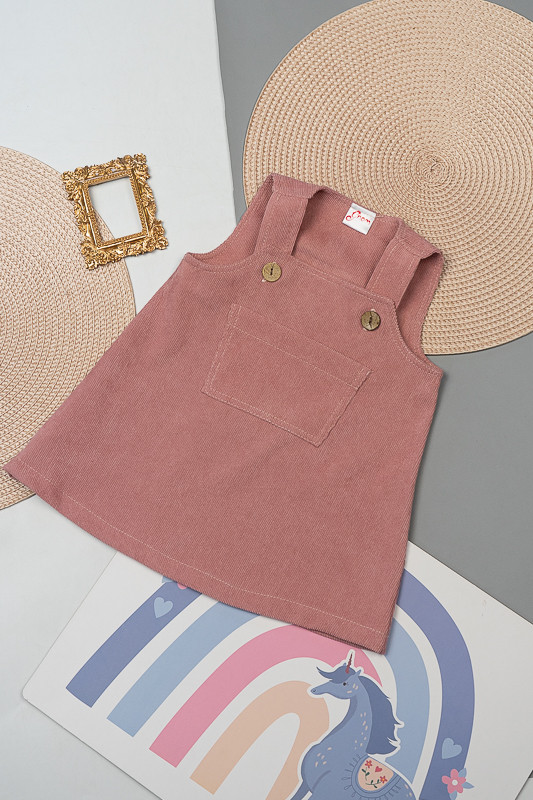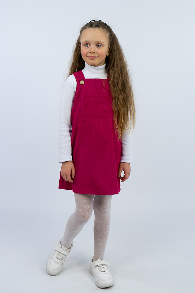 Зручний та практичний сарафан на бретелях для маленьких дівчаток виготовлений з мікровельвету. Це натуральна тканина з високою щільністю, легка та приємна на дотик. Передню частину виробу прикрашає велика нагрудна кишеня. Бретелі застібаються на великі ґудзики, якими можна регулювати довжину бретелей. Вироби з вельвету витримують регулярне прання при температурі 40°C та сушіння в сушильній машині або на відкритому повітрі.