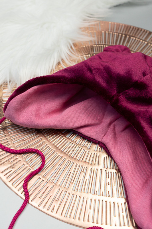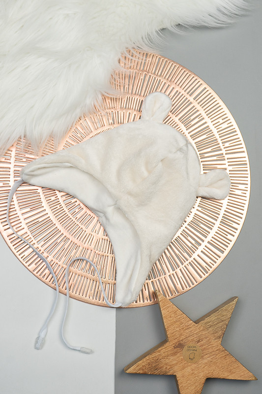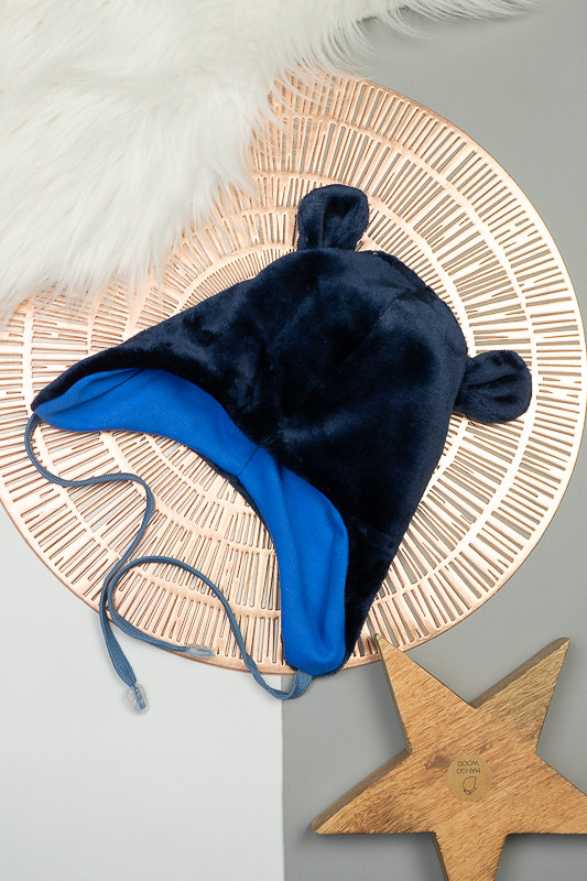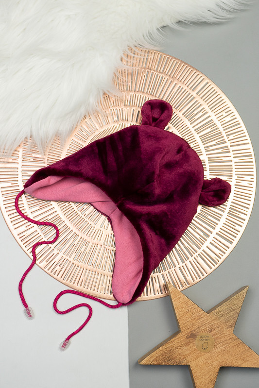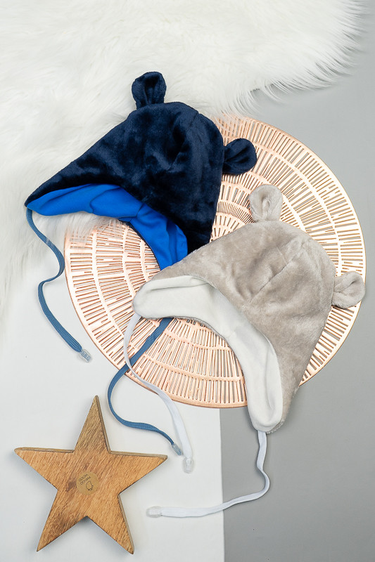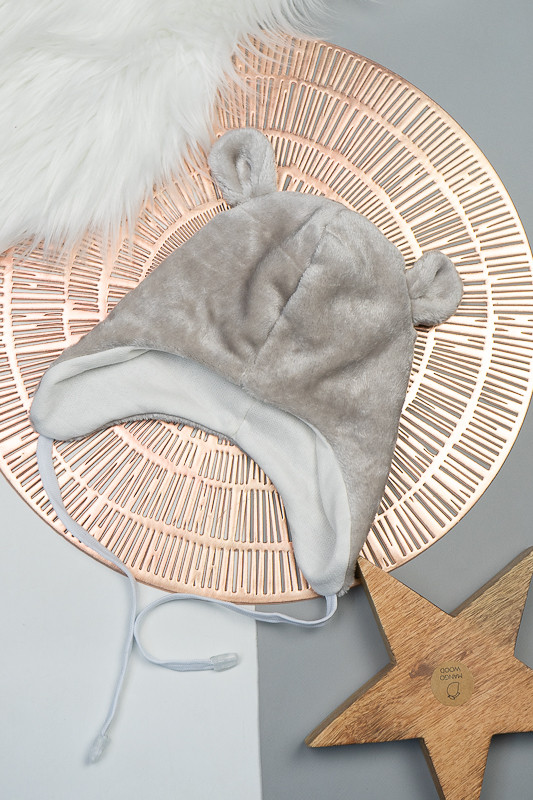 Тепла шапка на підкладі виготовлена для немовлят від 3-х до 6-ти місяців. Модель пошита з тонкої махри або велсофту. Це трикотаж з м'яким ворсом. При цьому матеріал дуже легкий, повітропроникний, гіпоалергенний. Підкладом є начісний футер. Рекомендований догляд - це делікатне прання при температурі не більше 35°C.