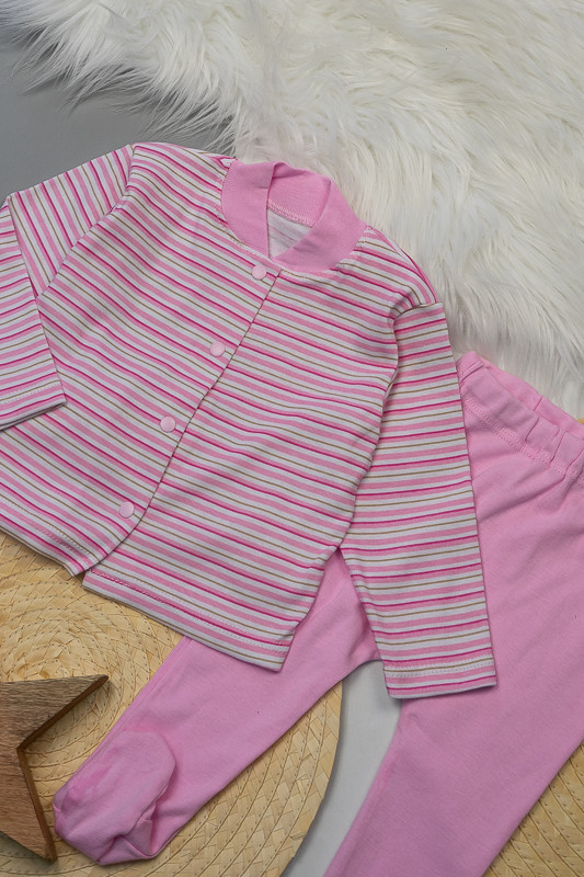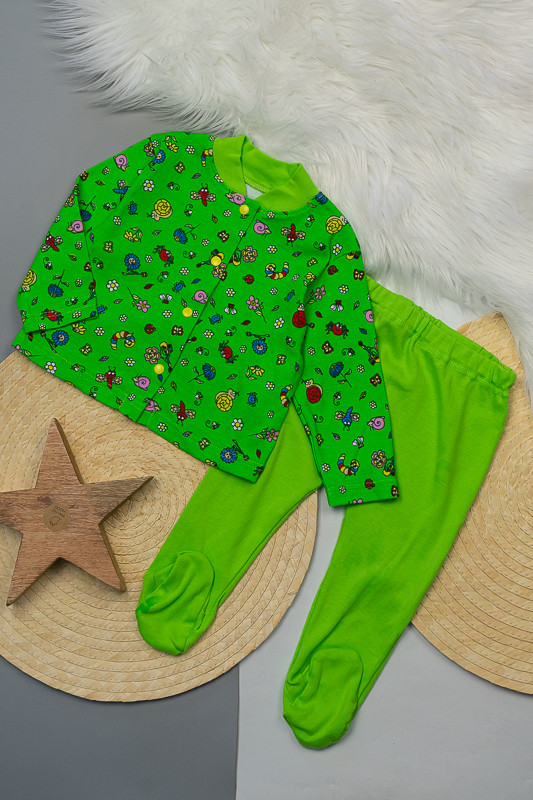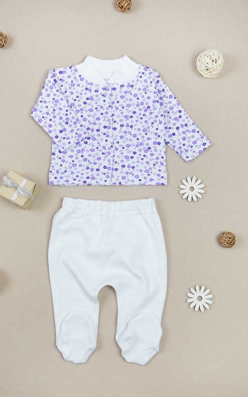 Комплект для самих маленьких складається з кофтинки на кнопках і повзунків. Виготовлений він з трикотажного полотна - рібана, яка користується великою популярністю у виробництві нижньої білизни і дитячого одягу. Матеріал містить 100% бавовна без добавок. Він абсолютно безпечний. Одяг з цього матеріалу можуть носити люди, які страждають алергією, а також діти з самого раннього віку. Вироби з рібани прекрасно зберігають форму, здатні витримати численні прання, не дають усадки, не покриваються катишками. При правильному догляді довгий час не втрачають первинний вигляд. Відмінно пропускає повітря і гігроскопічна, що забезпечує пухка будова матеріалу. Рекомендується прати у пральній машині при температурі води не більше 30 ° С.