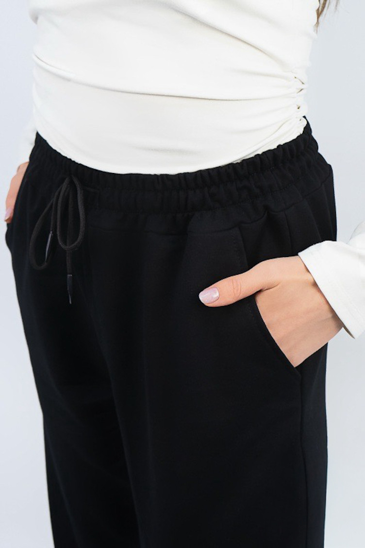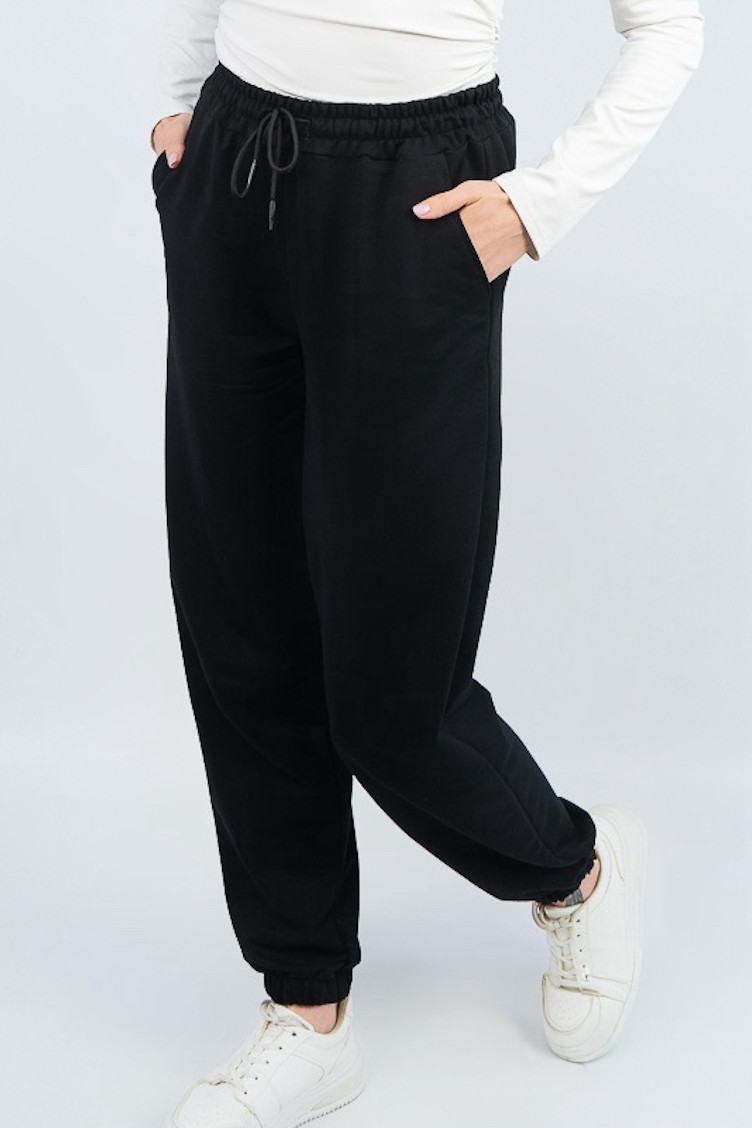Спортивні жіночі штани стануть приємною обновою для повсякденного гардероба. Вони комфортні та зручні. В бокових швах мають прорізні кишені. Срізи ніг оброблені еластичними манжетами. Широкий пояс доповнений шнурком для надійної посадки по фігурі. Модель стане відмінним доповненням до світшоту, джемперу або худі. Виготовлено виріб із трикотажного полотна – двунитка. Матеріал має позитивні споживчі якості: добре вбирає вологу; ефективно пропускає повітря; не утворює пилок (ковтунів); не витягується при носінні; простий у догляді. Штани слід прати у теплій воді. Температури води, що дорівнює 30°C, буде достатньо для якісного прання матеріалу.