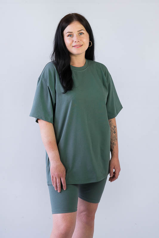 Жіночий комплект в спортивному стилі від ТМ «Гном» подарує вам відчуття комфорту та зручності. Складається він з подовженої футболки «oversize» та еластичних трес. Виготовлений комплект у різній кольоровій гамі, на будь-який смак. Крім зручного крою перевагою моделі є матеріал. Це м'яке та легке трикотажне полотно – фулікра, яке щє називають стрейчевим куліром. Його склад – це 95% бавовни та 5% лайкри. Полотно еластичне та приємне до тіла. Матеріал має гарну гігроскопічність, не викликає алергію. Виріб невибагливий у догляді, його можна прати при температурі до 40°C у делікатному або ручному режимі, не використовувати відбілювачі або порошки з відбілювачами.